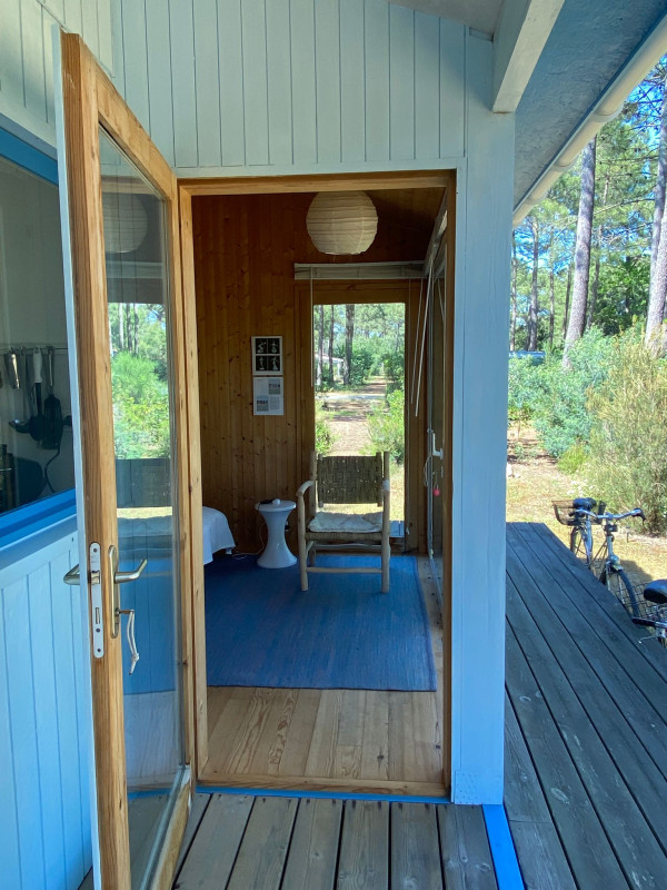 Bungalow in Gascogne 18 zu vermieten: für 2 - 4 Personen. Küche, Bad mit Innendusche, Salon mit Esstisch, Sofa und zweitem Doppelbett, großes Schlafzimmer mit bodentiefer Fensterfront und Blick in den Pinienwald sowie separatem WC, Abstellraum mit Waschmaschine, Veranda und Terrasse, ein großer gepflegter Garten mit Gartendusche bietet Schatten und Sonne, Kopfkissen, Bettdecken und Decken sowie drei Fahrräder verfügbar, sehr ruhig gelegen, 10 min zu Strand 2 und Einkaufszentrum; Bettwäsche, Handtücher für Küche und Bad werden nicht gestellt. Kosten zu Kaution, Miete und Reinigungspauschale auf Anfrage, Kontakt per e-mail: