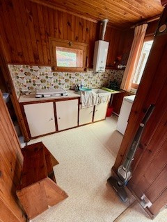 La cuisine est séparée par une armoire et est très simple. Mais elle contient tout ce dont on a besoin.